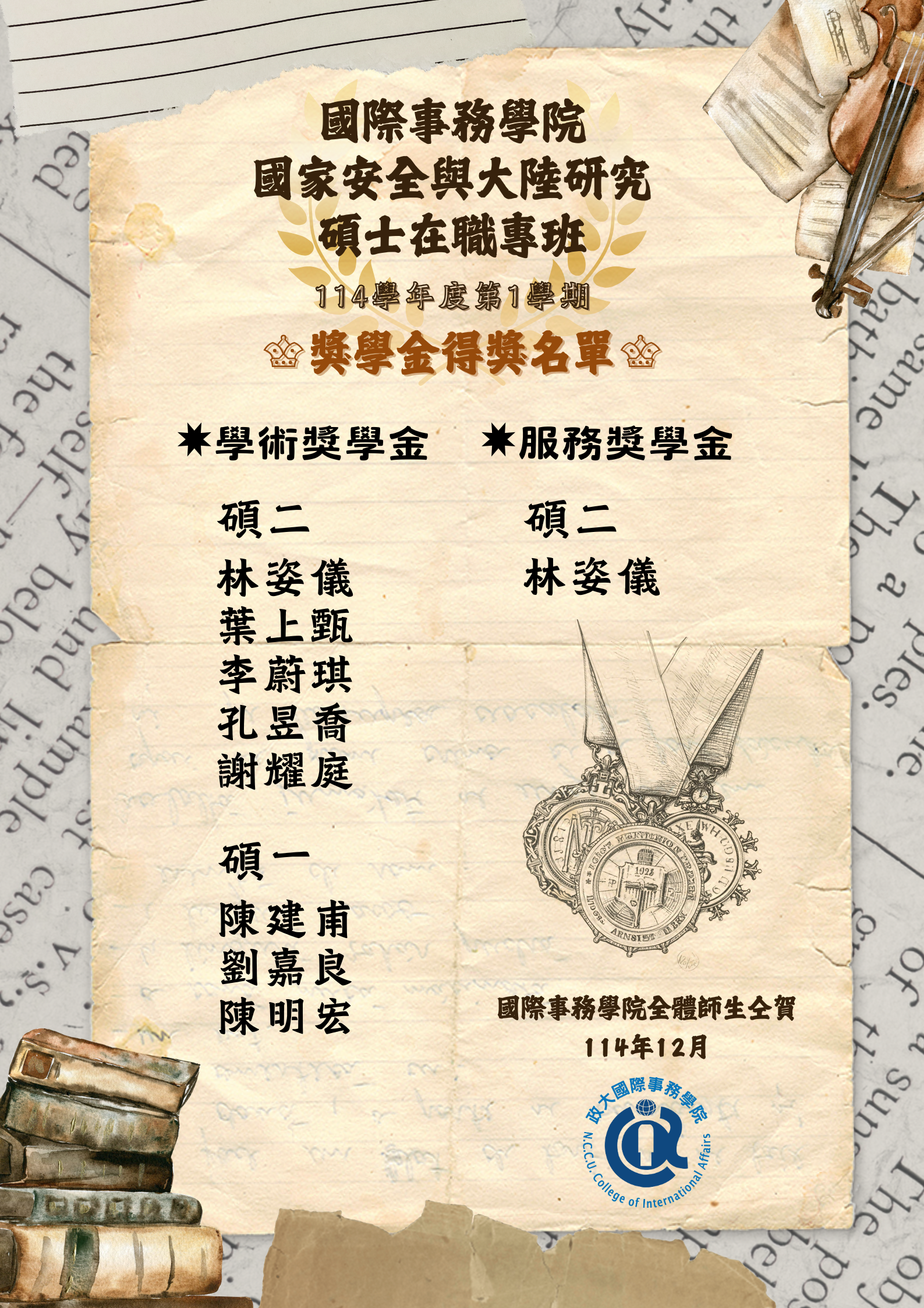 114學年度第一學期國家安全與大陸研究碩士在職專班學術暨服務獎學金獲獎名單