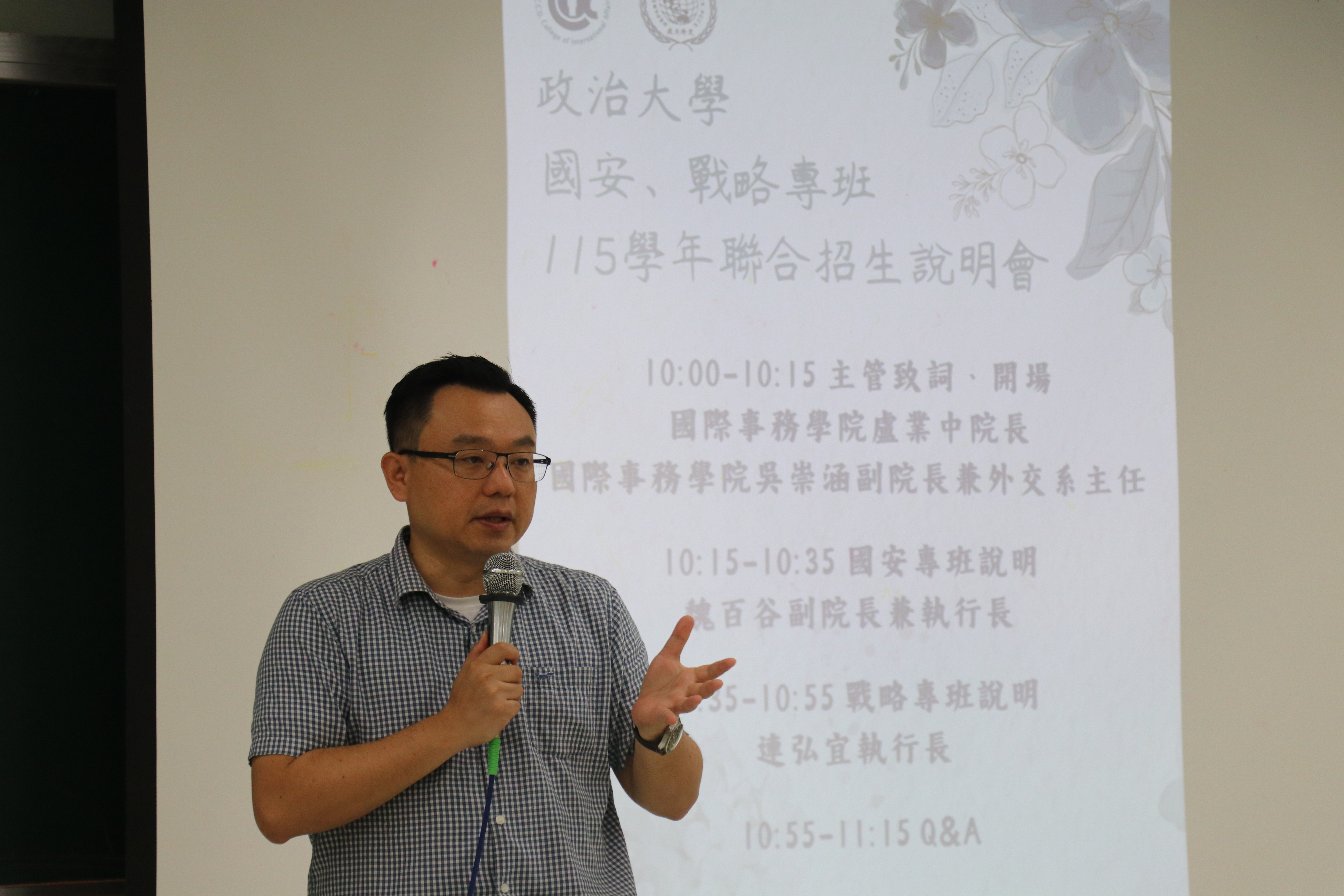 國安專班簡介由國際事務學院副院長兼專班執行長魏百谷進行說明。魏執行長首先向與會者們說明研究計畫審查重點有二,一為研究主題,二為文獻回顧。前者中包含研究背景、動機、問題意識等,後者則為整理現有文獻的研究方法與研究結果,同時比較自身研究與現有文獻的不同之處,進一步提升自身論文的研究價值。魏執行長強調,資料準備質重於量,能夠言之有物、內容精實並熟悉脈絡,更能在面試時脫穎而出。